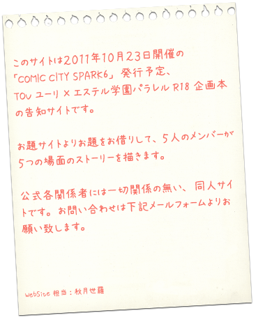 | ●その他短編(アスシェリ・ヒュパス、他含む) 『だから、あと少しだけ』[ペーパーより再録] シェリア→アスベル。青年期序盤、ラントへの道中。 09年冬コミのペーパーより再録。 『もう一度、あの笑顔を』[ペーパーより再録] 上記のアスベル視点。アスベル(→)シェリア。 09年冬コミのペーパーより再録。 |
